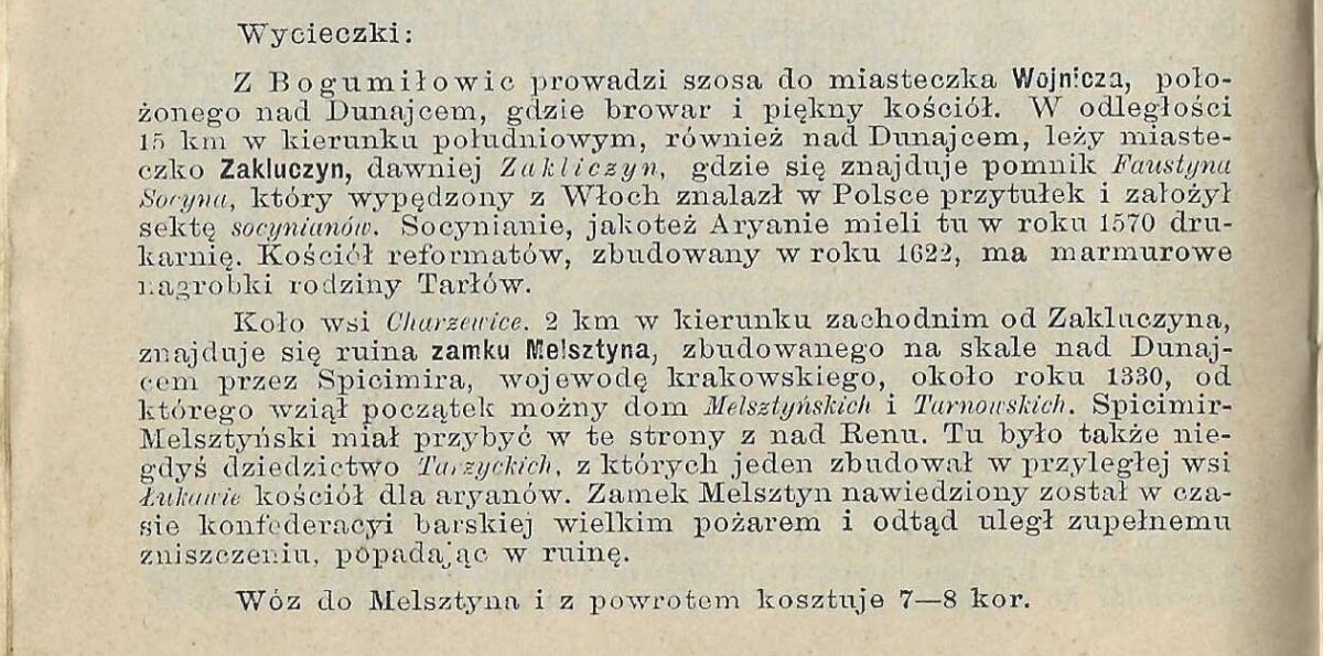 XXVI Spotkanie Towarzystwa Miłośników Ziemi Zakliczyńskiej2024-12-15Elżbieta Granowska (królowa Polski, prawnuczka Spicimira Leliwity) w najnowszej publikacji historycznej2024-12-18 ZAKLUCZYN vel ZAKLICZYN oraz MELSZTYN w ,,Przewodniku ilustrowanym po cesarsko królewskich austriackich kolejach państwowych na szlakach (…)” wydanym w Wiedniu w 1892 roku. 2024-12-17 WRÓĆ Książka to unikat z domowej biblioteki. ✍️ Wojciech Grzegorczyk Udostępnij Powiązane posty2025-09-02Ocalałe fragmenty wyposażenia z zamku w Melsztynie w kościele parafialnym pw. św. Idziego Opata w Zakliczynie n/DCzytaj więcej2025-09-01Zamek w Melsztynie jako kamieniołom?Czytaj więcej2025-08-25Biskup rodem z Zakliczyna!Czytaj więcejTablica epitafijna Franciszka Rychnowskiego i jego małżonki z grobowca jak wyżej2025-08-14Franciszek Rychnowski uważany jest za jednego z najzdolniejszych polskich wynalazców końca XIX i początku XX wieku.Czytaj więcej